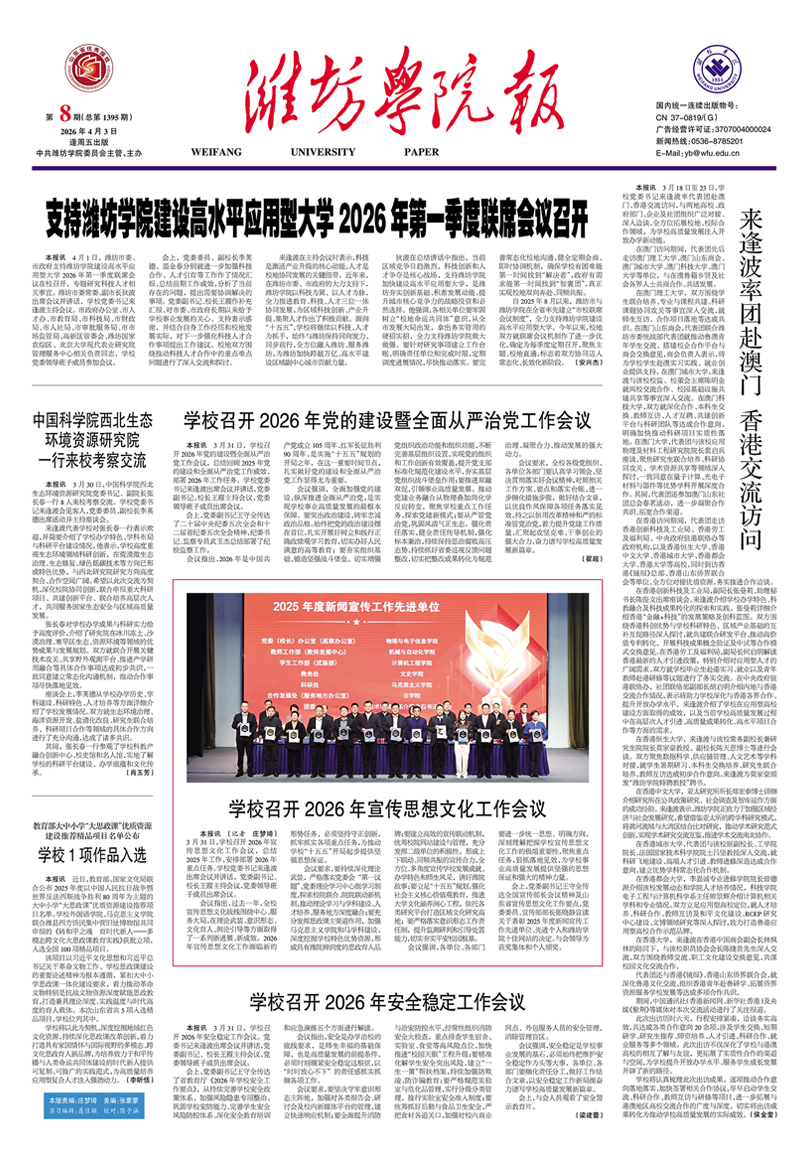 3月31日,潍坊学院召开2026年党的建设暨全面从严治党工作会议,总结回顾2025年党的建设和全面从严治党工作成效,部署2026年工作任务。学校党委书记来逢波出席会议并讲话,党委副书记、校长王霞主持会议,党委领导班...
