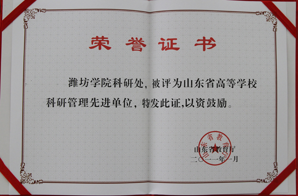 本站讯:近日,从山东省教育厅发布的文件《关于表彰山东省高等学校科研管理先进集体和先进个人的通报》上获悉,我校被评为山东省高等学校科研管理先进集体,科研处被评为山东省高等学校科研管理先进单位,科研处副处长邹远修被评为山东省高等学校科研管理先进个人。本次共对全省56个高等学校科研管理先进单位和100名先进个人进行了表彰。