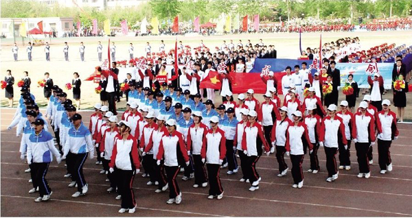 8点正,开幕式正式开始。伴随着嘹亮的运动员进行曲,彩旗方阵、花束方阵、裁判员方阵以及来自18个二级学院的学生代表队方阵,迈着整齐的步伐、喊着响亮的口号、精神饱满来到主席台前,他们分别用1分钟的时间,展示了本学院的办学特色。