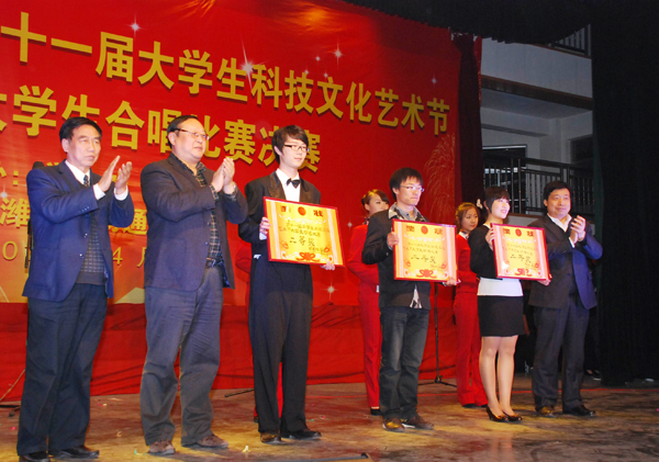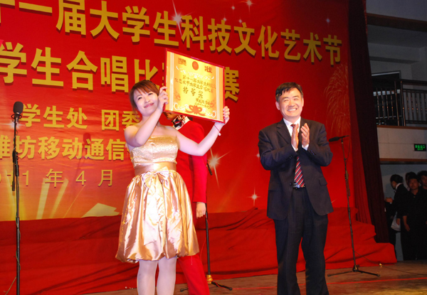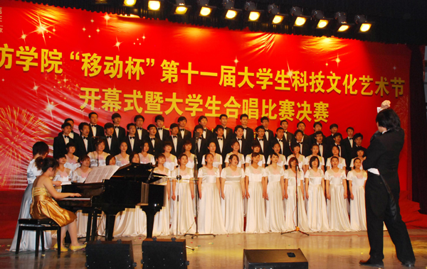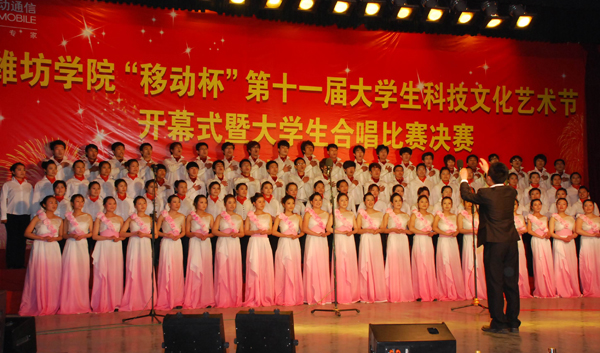 本站讯:4月21日晚,以“旗帜引领,创先争优,开拓进取,献礼校庆”为主题的潍坊学院“移动杯”第十一届大学生科技文化艺术节开幕式暨大学生合唱比赛决赛在闻韶楼排练厅开幕。开幕式以峥嵘岁月、高举旗帜、梦想启航三个板块的合唱比赛为载体,被选拔出的11个二级学院代表队以诚挚铿锵的歌声为学校的锦绣明天送上了最美好的祝福。