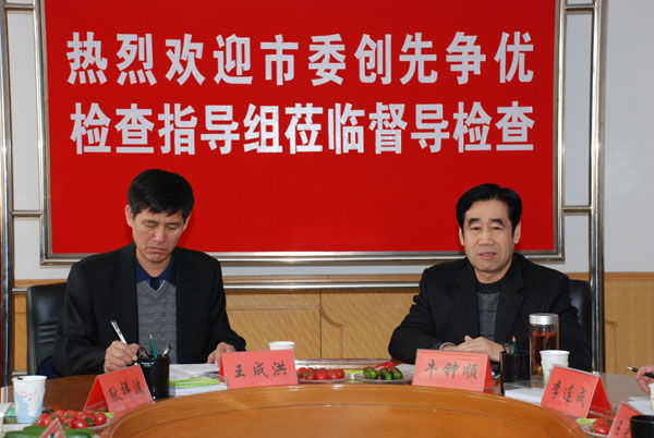 本站讯:4月1日,市委创先争优巡回检查指导二组一行5人,在组长、市纪委派驻第二纪检组副书记王成洪的带领下,来学校督导检查创先争优活动开展情况。学校党委副书记牛钟顺主持情况汇报会并强调指出,“三四一四三”的总体工作框架,是我校创先争优活动的最大着力点。检查组通过听取汇报、查看材料、抽查基层党组织,认为我校创先争优活动组织领导有力,在全市起到了打头阵、做标兵的作用。