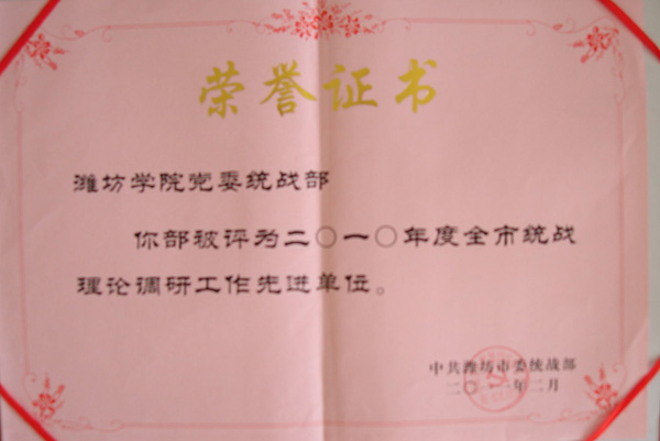 学校党委统战部被评为“2010年度全市统战理论调研工作先进单位”,蔡兰荣同志被评为“全市统战理论调研、宣传和信息工作先进个人”,我校上报的《加强党外人士联系交友工作机制问题研究》(王长春、张云华)、《高校统一战线在构建和谐社会中的独特优势及其作用发挥》(宋晓芹)分获2010年度全市统战理论调研宣传优秀成果二等奖和优秀奖。