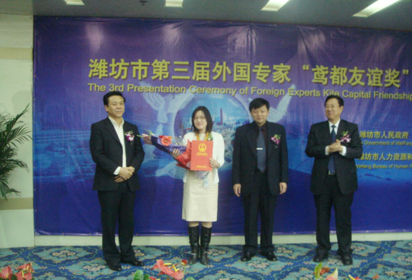 本站讯:12月14日,潍坊市举行第三届外国专家“鸢都友谊奖”颁奖典礼,奖励为潍坊经济社会发展做出突出贡献的外国专家,8名在潍工作的外国专家获此殊荣,我校日本籍日语教师工藤徹子榜上有名。这也是自2007年第一届“鸢都友谊奖”以来,我校外籍教师连续第三次获此荣誉。