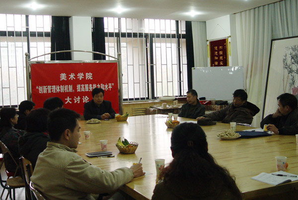 美术学院的领导班子成员、两“办”主任、教研室主任参加了研讨会。大家围绕本专题大讨论的主题,特别是就二级学院在学校管理中的地位和作用问题展开了热烈地讨论。王清明在认真听取了大家的发言后讲了三点意见。一是二级学院在管理中要积极探索,定好目标,真抓实干,争取创出好的经验。二是要走内涵发展之路。二级学院和学校的目标是高度一致的,要抓好教师队伍和科研队伍的管理和建设,工作上要有突破和创新。三是要积极干好本职工作。要正视目前遇到的困难,发扬艰苦奋斗的优良传统,充分发挥主观能动性,积极承担责任,踏踏实实把工作做好。
