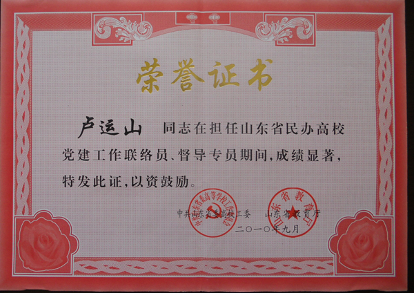 本站讯:日前,中共山东省委高校工委、山东省教育厅对第一批民办高校督导专员、党建工作联络员两年来的工作进行了考评和总结,我校体育学院党总支书记卢运山同志被考核为优秀等级,受到省委高校工委和省教育厅的表彰。