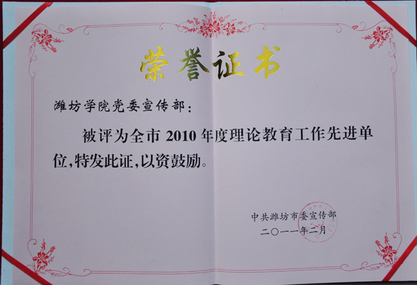本站讯:2011年2月,潍坊学院党委宣传部被评为潍坊市2010年度理论教育工作先进单位。刘作民同志被评为潍坊市2010年度优秀理论教育工作者。(潍院宣)