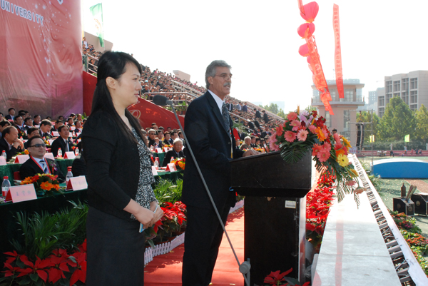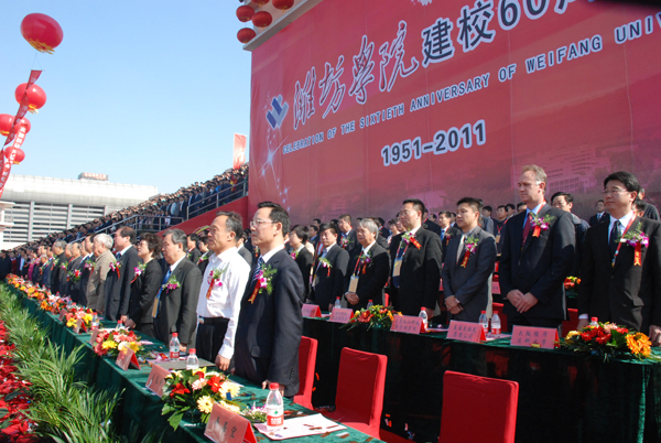 山东科技大学党委书记、校长王春秋和美国东北州立大学校长特别助理罗恩·康比亚诺,分别代表国内外友好院校在庆祝大会上致辞,对潍坊学院60年校庆表示祝贺,为潍坊学院的快速发展和取得的突出业绩感到高兴,对潍坊学院的美好前景和学校间的良好合作充满期待。