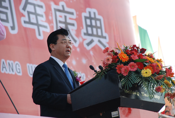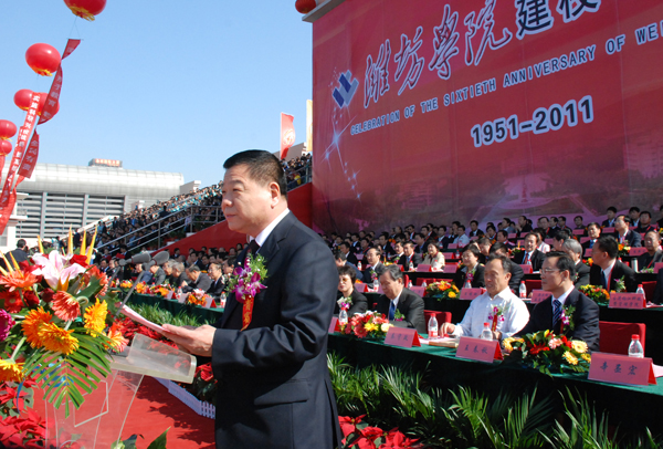 潍坊市人民政府市长许立全代表潍坊市委市政府向学校表示祝贺。他指出,60年来,潍坊学院几经整合,砥砺奋进,薪火相传,教泽绵延,为国家和地方培养了一大批优秀人才,为地方经济建设与社会发展做出了积极贡献!成为了齐鲁大地高等教育的一朵奇葩、宣传潍坊城市形象的一张靓丽名片。希望潍坊学院以60周年校庆为新的起点,进一步加快区域综合性大学建设,大力提升人才培养水平,大力增强科研创新能力,大力服务经济社会发展,以服务和贡献开辟自身发展新空间。潍坊市委市政府将一如既往地支持潍坊学院的改革建设和发展,按照省市共建协议的要求,进一步加大对潍坊学院的政策倾斜和财政投入,积极推动省市共建管理体制的调整完善,不断改善学校办学条件,支持学校进一步深化教育教学改革,扩大校际、校企、校地合作,在服务和推动地方经济社会发展中发挥更大作用。