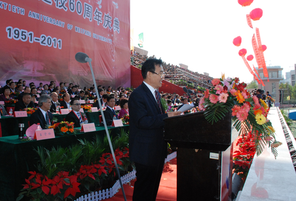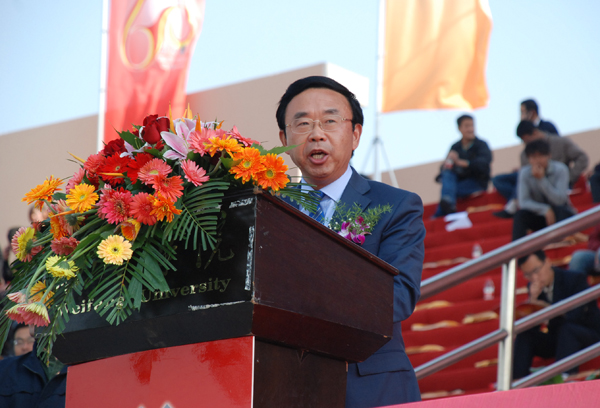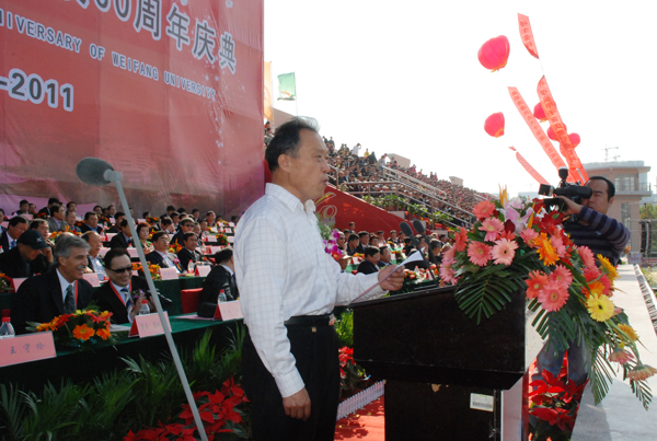 潍坊学院院长王守伦代表学校致辞,向长期以来关心、支持学校发展的各级领导、各界朋友、国际友人以及对母校赤子情深、关爱备至的校友表示衷心感谢。他回顾了学校60年的光荣历史和辉煌成就,指出,学校始终坚持以人才培养为根本任务,以教学工作为中心,积极推进教育教学改革,教育教学质量不断提高,科研水平稳步提升,服务地方经济社会建设的能力不断增强,各项事业取得了显著成绩,为国家培养了11万余名优秀人才,校友的足迹遍布祖国各地,学校的知名度和美誉度不断提升。60年的不懈奋斗,磨砺了百折不挠、知难而进的顽强意志,熔铸了自强不息、追求卓越的坚韧品格,形成了奋力拼搏、勇夺第一的伟大精神,凝聚了爱校如家、团结奉献的深厚情怀。他表示,60年校庆是我校承前启后、继往开来的里程碑,是我们团结奋进、再创辉煌的新起点。学校将全面贯彻落实科学发展观,按照“抓基础,上水平,创特色”的总体思路,进一步总结办学经验,彰显办学特色,升华办学理念,凝聚发展力量,紧紧围绕提高人才培养质量这一核心,坚持“教学立校、科研兴校、人才强校、特色名校”战略,努力实现教学质量、科研层次、管理水平和服务能力的全面提升,增强整体竞争实力,争取进入国家新建本科院校示范建设行列,基本建成特色鲜明的综合性大学,创造新的辉煌。