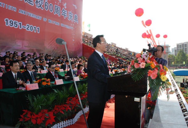 山东省人民政府副省长黄胜代表省委省政府向潍坊学院全体师生员工和广大校友表示热烈的祝贺。他充分肯定了学校的办学思路和60年来取得的显著成绩,对学校的优良校风、师生的良好精神风貌表示高兴和满意。希望潍坊学院认真贯彻落实胡锦涛总书记在庆祝清华大学一百年周年大会上的重要讲话精神,紧紧抓住山东省实施“三区”建设战略的难得机遇,大力加强内涵建设,不断提高人才培养质量,提升办学水平,增强社会服务能力,争取早日把学校建设成为特色鲜明、人们满意的知名高校。