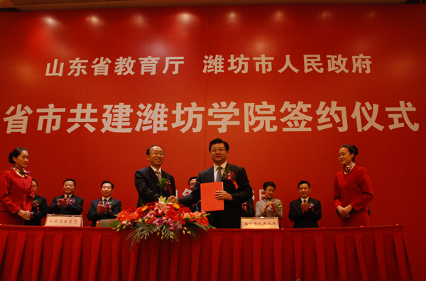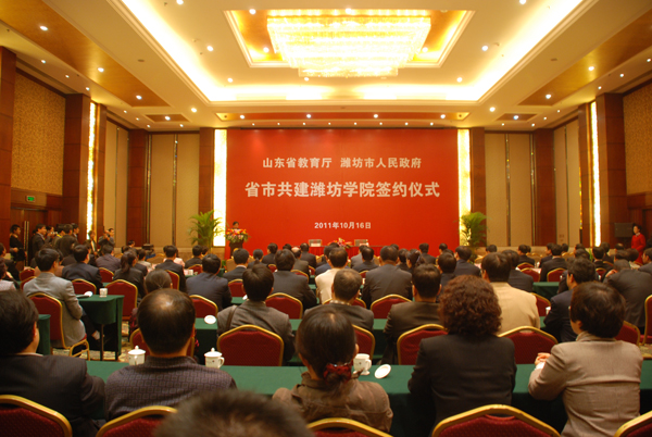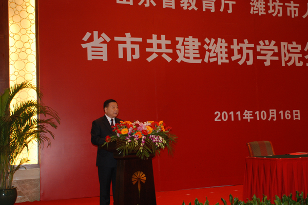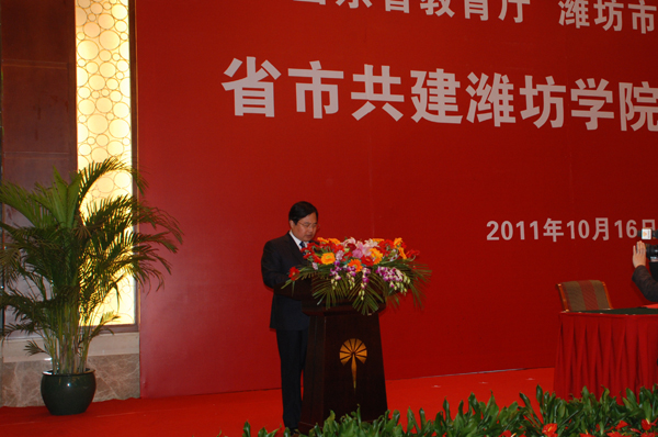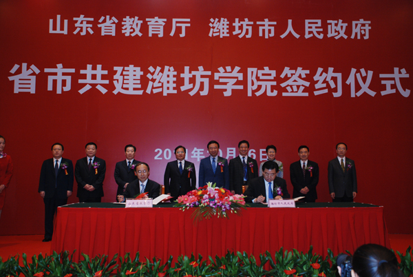 本站讯:10月16日上午9点,山东省教育厅与潍坊市人民政府省市共建潍坊学院签约仪式在富华大酒店多功能会议厅隆重举行。山东省高校工委书记、教育厅厅长齐涛与潍坊市委副书记、市长许立全签署《关于进一步推动省市共建潍坊学院的协议》。潍坊市委书记、市人大常委会主任张新起,齐涛,潍坊学院党委书记辛丕宏,分别在仪式上讲话。签约仪式由潍坊市委常委、常务副市长胡岗主持。山东省副省长黄胜,山东省财政厅副厅长庞敦之,潍坊市委常委、市委秘书长刘德成,潍坊市副市长王桂英,潍坊学院院长王守伦,潍坊高新区党工委书记、管委会主任赵志远,潍坊市政府秘书长宋赤锋出席签约仪式。