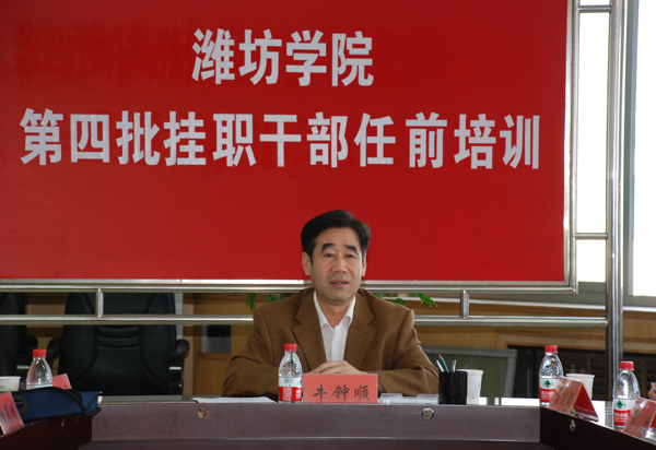 牛钟顺说,在市委、市政府的大力支持下,经市委组织部的指导帮助和各挂职单位的大力配合,从2010年3月起,我校已先后选派了三批共55名同志参加挂职锻炼。总的看来,他们经受了实践的锻炼和考验,能力素质有了明显提高,在推动校地校企合作、促进挂职单位工作等方面也作出了积极贡献,达到了预期的效果。根据地方经济文化建设和学校发展的需要,经学校党委研究,并报潍坊市委、市政府同意,我校将于近日派出第四批23名挂职干部。由于我们长期在高校工作,业务单纯,接触面较窄,工作中存在着一定的局限,特别是对党政机关和企业的工作性质等不甚熟悉。为此,进行这次任前培训,就是为了使大家能够更快、更好地适应新的工作。他希望大家认真学习领会培训内容,多与前三批挂职干部交流和沟通,多渠道了解和熟悉挂职单位的情况,以便更好、更快地融入新的工作之中。