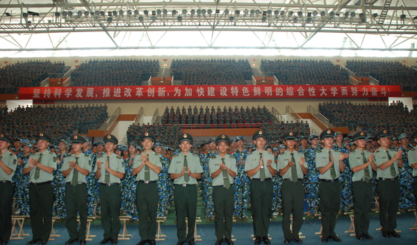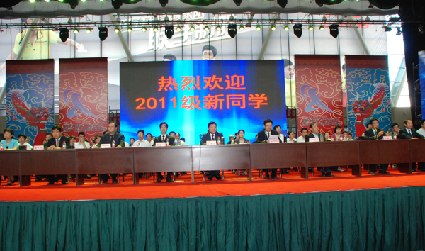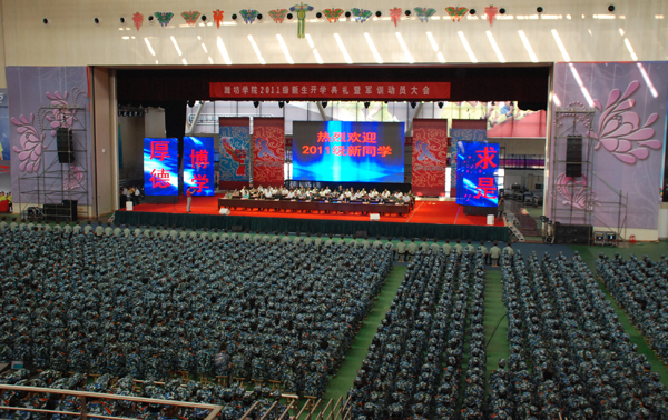 本站讯:9月6日,2011级新生开学典礼暨军训动员大会在校体育馆隆重举行。校领导辛丕宏、王守伦、牛钟顺、王慧汉、冯滨鲁、邢同学、王清明、丁子信、马茜华及驻潍某部张国宝少校出席大会并在主席台就坐。院长王守伦在讲话中对新同学提出了要求和希望。大会由副院长冯滨鲁主持。二级学院及各部门负责人、来自祖国各地的29个省、市、自治区的6000余名新生参加了开学典礼。