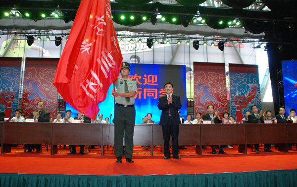 会上,王守伦向军训团授军训团团旗。副院长邢同学宣读了2011级新生军训团名单。