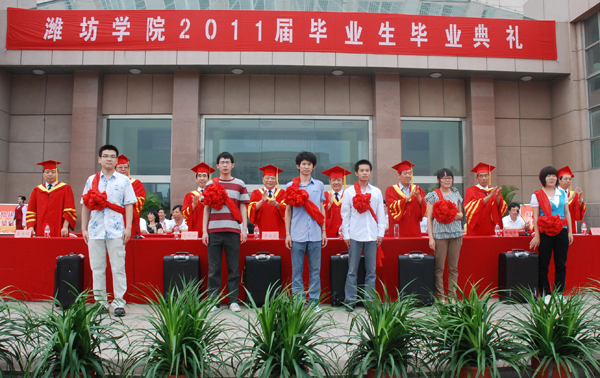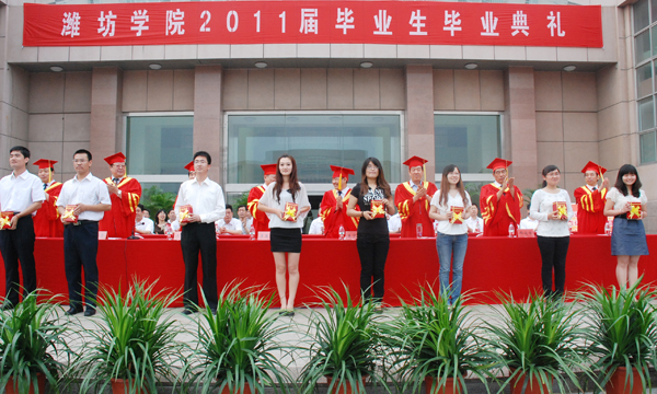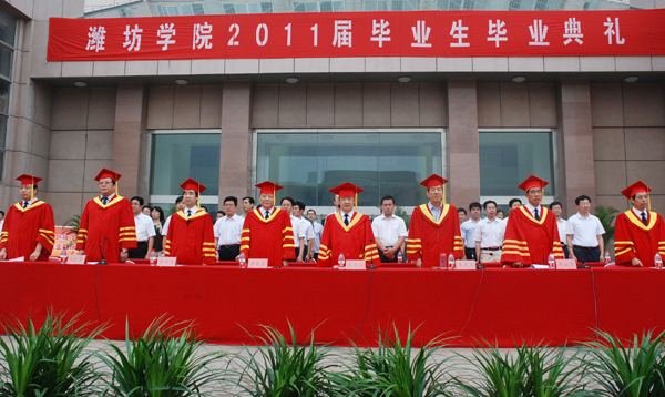 毕业典礼在庄严的国歌声中开始。院长王守伦深情寄语毕业生。他说,2011届毕业生在校期间,所展现出的爱校如家的价值追求和勇于担当的责任意识感人肺腑;心系灾区的无疆大爱和济世兴邦的使命情怀令人动容;毕业生们为母校建设发展做出的业绩,将永远镌刻在潍坊学院的光荣史册上。今年是学校建校60周年,建校以来,学校已向社会输送各类人才近10万人,他们分布在祖国四面八方,为经济社会发展做出了重要贡献,赢得了广泛的社会声誉,为学校增添了光彩。每每想到这些校友,母校就感到无比的自豪。他希望2011届毕业生带着信心上路,带着微笑上路,带着理想上路,奋力创造更加辉煌灿烂的明天。