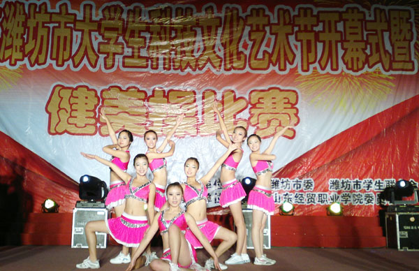 本站讯:在2011年潍坊市大学生科技文化节开幕式暨健美操比赛中,由我校幼教特教师范学院9名师生组成的潍坊学院代表队以优异的表现脱颖而出,获得团体一等奖第一名的佳绩。