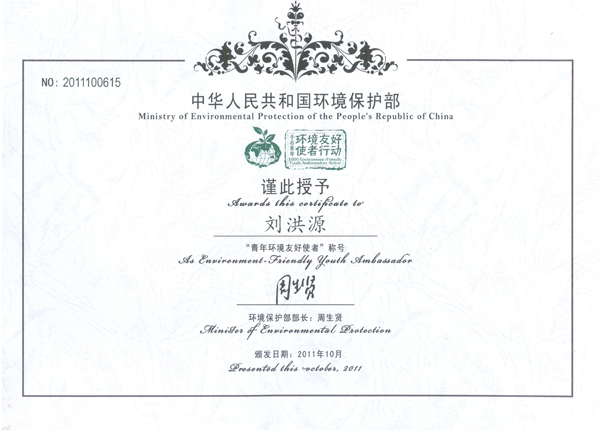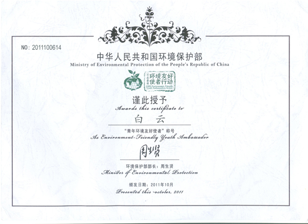 本站讯:10月15日至16日,2011年“千名环境友好使者行动”——华北地区青年环境友好使者培训在北京举行。我校学生社团联合会主席、文学与新闻传播学院2009级学生白云,大学生环保协会骨干成员、计算机与通信工程学院2010级学生刘洪源两名同学赴京参加了此次培训,并获得由组委会签署的“青年环境友好使者”证书。