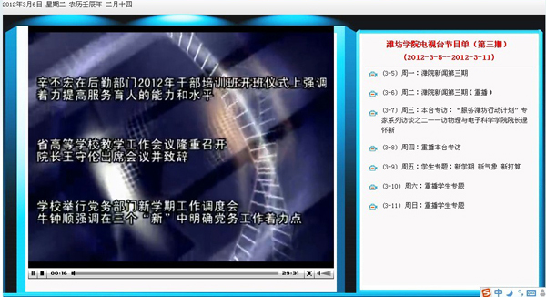 本站讯:3月5日,经过学校电视台全体师生员工的共同努力,学校电视台实现了在校园网点击即时播放。观众只要点击潍坊学院网站首页的“学校电视台”,即可收看到最新的潍院新闻。