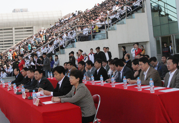 本站讯:我校第十一届田径运动会在4月26日上午8:00拉开帷幕。学校领导辛丕宏、王守伦、邢同学、王清明、丁子信、马茜华出席开幕式。院长王守伦致开幕词。开幕式由副院长王清明主持。各单位、各部门主要负责同志主席台就坐。