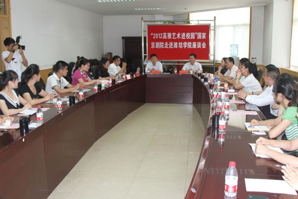 本站讯 6月13日,国家京剧院二团的表演艺术家们与学生进行座谈。院长王守伦、副院长邢同学出席座谈会。团委负责同志及来自各二级学院的20余名学生参加了会议。