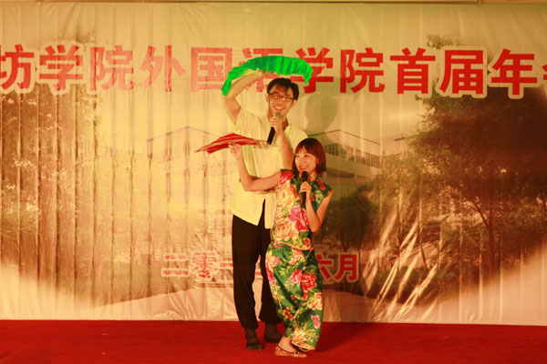 年会在情歌串烧中拉开了序幕。外国语学院的老师们各自表演了精心准备的节目,有歌曲、葫芦丝独奏、相声、小品、黄梅戏、诗朗诵、T台走秀等。其间穿插的PPT放映回顾了外国语学院30多年的发展历程。外院的老师们用无私的敬业精神充分发挥了传帮带的作用。青年教师们奋发图强,授课效果优良,在各种竞赛中表现突出,成绩卓越。与此同时,他们还有更为丰富的业务生活,在各种文艺演出中都可以看到外院教师靓丽的身影。王守伦院长在最后的致辞中指出,外国语学院已经创造了辉煌的历史,明天必将更加美好。最后在交谊舞表演——相逢是首歌中落下帷幕。