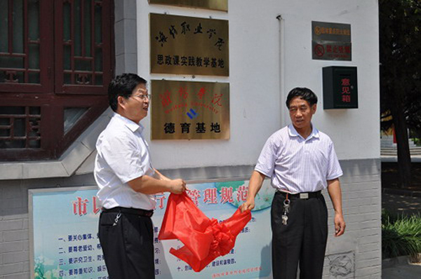 本站讯 6月19日,我校与潍坊市革命烈士陵园管理处共建德育基地签约揭牌仪式在烈士陵园举行。副院长邢同学与潍坊市民政局副局长韩华南共同为基地揭牌,学生工作部(处)负责人与潍坊市革命烈士陵园管理处杨磊主任分别签署了大学生德育基地共建协议。我校学生工作部、潍坊市革命烈士陵园陵园管理处相关人员及我校7名受聘义务讲解员(学生)参加了活动。