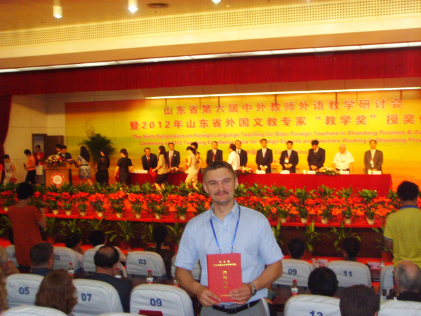 本站讯 2012年6月16日至18日,山东省第六届中外教师外语教学研讨会暨2012年山东省外国文教专家“教学奖”授奖仪式在临沂大学沂蒙大讲堂举行。我校乌克兰籍外教尤金(Shmatko Yevgen)作为获奖外国专家出席并受奖。