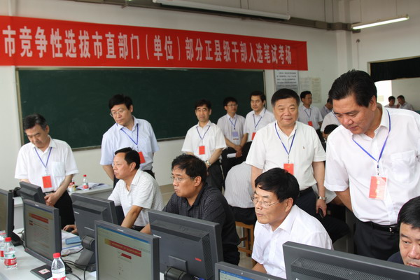 本站讯 潍坊市竞争性选拔市直部门(单位)部分正县级干部笔试于7月14日在我校举行。市委副书记王献玲在校党委书记辛丕宏、院长王守伦、党委副书记牛钟顺的陪同下巡视了考试现场。