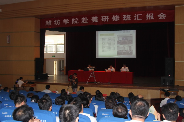 本站讯 按照学校海外培训计划,暑假期间,我校部分中层干部及重点学科带头人组成的赴美培训班,完成了在美国东北州立大学的教育培训。8月31日,赴美研修班举行汇报会。党委书记辛丕宏强调,充分认识高等教育大众化发展的新挑战,自觉深化教育教学改革,坚定不移地推动开放办学。会议由院长王守伦主持。学校领导牛钟顺、冯滨鲁、邢同学、王清明、丁子信、马茜华出席汇报会。