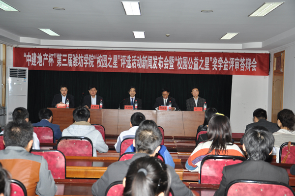 本站讯 10月24日,“中建地产杯”第三届“校园之星”评选活动新闻发布会暨“校园公益之星”奖学金评审答辩会举行。学校党委副书记牛钟顺出席发布会并宣布“校园之星”评选活动全面启动。发布会由副院长邢同学主持,鸢都义工联合会主席王新航,潍坊中建地产有限公司副总经理石方、总经理助理李林,学校团委、院报编辑部负责同志出席发布会。