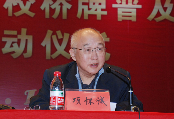 项怀诚在致辞时介绍了本次桥牌普及活动的宗旨和实施计划,勉励青年学子们培养多方面的素质,从各方面锻炼自己,做高素质的人才。