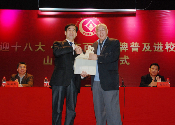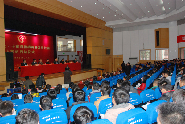 本站讯 11月10日,“喜迎十八大·十市百校桥牌普及进校园”活动首站暨山东站启动仪式在我校闻韶楼报告厅举行。原国家财政部部长、中国桥牌协会主席项怀诚莅临出席。仪式开始前,党委副书记牛钟顺向项怀诚汇报了我校的基本情况,项怀诚对我校的办学历史、办学规模和取得的成就赞赏有加。在启动仪式上,项怀诚致开幕辞,并向我校赠送桥牌器材。