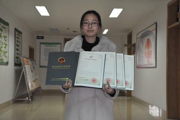 干净温婉的气质,眼神中透着一丝坚定,很难想像到一个瘦小的女生身上会蕴藏着那么大的能量。她就是五项实用新型专利证书的得主——潍坊学院2009级学生孙旭方。