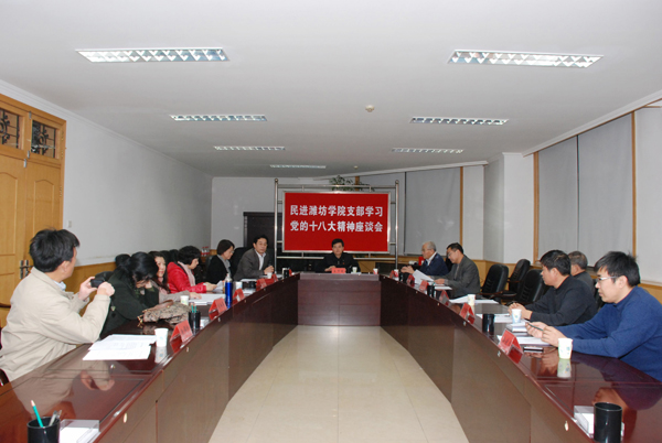 在民进潍坊学院支部学习贯彻党的十八大精神座谈会上,民进潍坊学院支部负责人传达了了民进中央关于学习贯彻中国共产党第十八次代表大会精神的决定,参加会议的民进成员进行了交流发言,纷纷表示要认真学习、深刻领会党的十八大精神,将其真正落实到实际工作中去。王贤臣在座谈会上讲话,对民进潍坊学院支部近年来的工作表示赞许,对该支部学习贯彻党的十八大精神、下一步工作的开展等提出了要求。