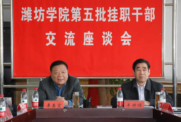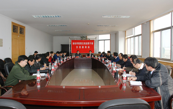 本站讯:12月15日,学校举行第五批挂职锻炼干部交流座谈会。党委书记辛丕宏在会上要求参加挂职锻炼的干部要带头学习贯彻党的十八大精神、带头服务地方经济社会发展、带头转变作风深入实际,着力提高自身素质和能力。座谈会由党委副书记牛钟顺主持。办公室、党委组织部负责同志、全体第五批挂职干部参加了座谈会。