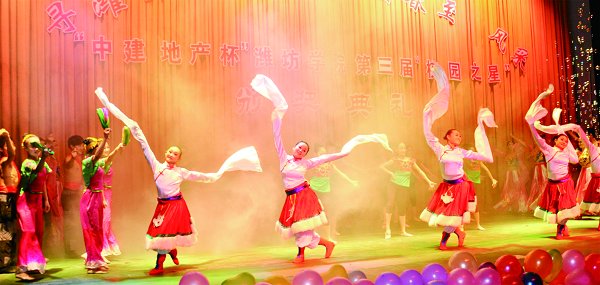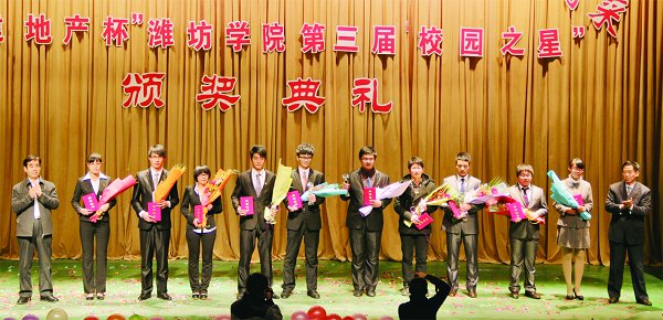 本站讯 12月18日晚,由学校团委、院报编辑部联合主办的“寻潍院最美学子,展青春至炫风采”——“中建地产杯”潍坊学院第三届校园之星颁奖典礼在图书馆报告厅隆重举行,学校领导辛丕宏、王守伦、牛钟顺、邢同学出席晚会并为获奖选手颁奖。500余名师生观看了晚会。