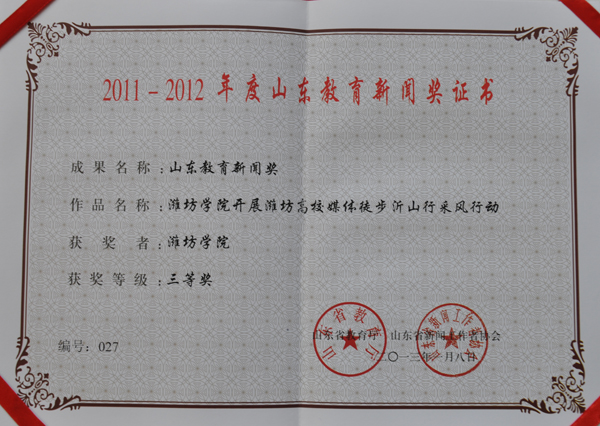 本站讯 近日,2011—2012年度“山东教育新闻奖”评选活动结果揭晓,我校申报的作品——潍坊学院开展潍坊高校媒体徒步沂山行采风行动在此次活动中荣获山东教育新闻奖集体组织三等奖。