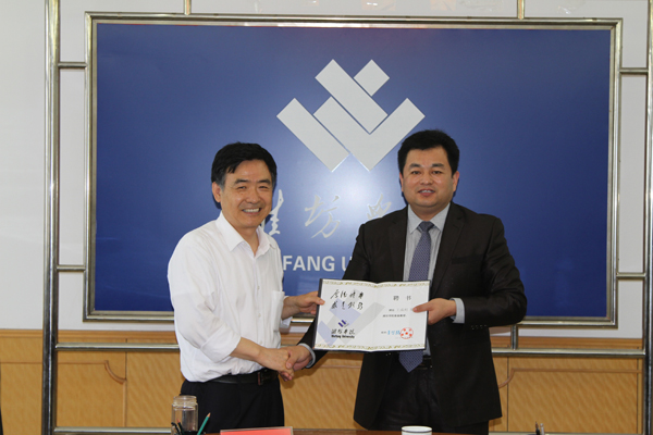 本站讯 5月27日,潍坊神舟重工机械有限公司董事长王成利,受聘为学校客座教授。院长王守伦为其颁发了聘书。