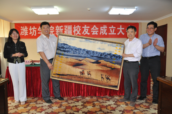 在热烈的掌声中,王守伦发表了热情洋溢的讲话并宣布潍坊学院新疆校友会成立。王守伦代表母校师生和校友总会向新疆校友会的成立表示热烈的祝贺,向为筹建新疆校友会付出辛勤努力的校友们表示衷心的感谢。他向与会校友介绍了母校建校63年来的发展变化,向关心母校发展并在各自岗位上为母校赢得声誉的新疆校友致以崇高的敬意与谢意。王守伦指出,新疆校友会的成立,搭建了一个良好的平台,必将进一步促进新疆校友与母校以及新疆校友之间的密切联系,为此,他热切期望并真诚祝愿新疆校友会越办越好。希望新疆的校友能够团结一致,互相帮助,共同发展,共同进步,为新疆的社会经济发展做出更大的贡献,为母校争得更高的荣誉。