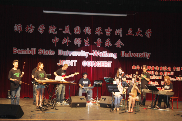 本站讯 6月17日晚,由国际合作交流处、音乐学院主办的潍坊学院-美国伯米吉州立大学中外师生音乐会在闻韶楼报告厅举行。学校党委副书记牛钟顺、副院长王清明、丁子信出席晚会。相关部门负责同志及师生代表一同观看了晚会。