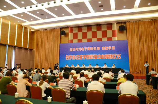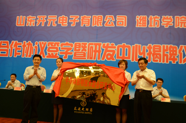 本站讯 7月5日,我校与山东开元电子有限公司技术合作签约仪式在昌乐举行。同时,双方合作成立的“半导体照明技术联合研究中心”揭牌。院长王守伦,副院长王清明,昌乐县有关领导出席仪式。我校科研处、物理与光电工程学院负责人,昌乐县科技局、经信局、招商局、知识产权局主要负责人,以及有关单位、街办、各大中型企业分管负责人参加了仪式。