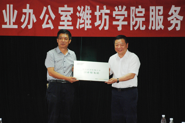 本站讯 7月9日,YBC潍坊市创业办公室潍坊学院服务站授牌仪式举行。潍坊市创业促进会会长杨卫东为服务站授牌。学校领导辛丕宏、王守伦、马茜华,潍坊市创业促进会常务副会长、秘书长胡凝熙,副会长、YBC办公室主任陈传恩,副会长王长寿出席授牌仪式。我校部分YBC创业导师、相关部门负责同志以及20余名创业大学生代表参加了授牌仪式。