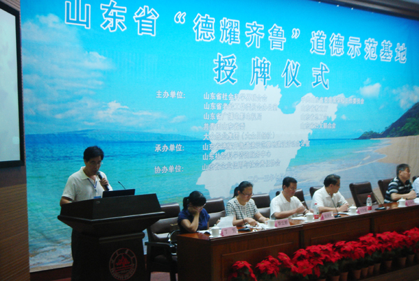 山东省“德耀齐鲁”道德示范基地建设活动,是由省社科联、省委高校工委、省老龄委、省教育厅、省广电局、省总工会、团省委、省妇联、大众报业集团(大众日报社)联合发起,这一活动旨在更好地宣传贯彻党的十八大精神,突显社会公德、职业道德、家庭美德、个人品德建设这一重要内容,充分发挥“德耀齐鲁”道德示范基地的榜样引领作用,积极推动全省形成知荣明耻、见贤思齐的良好道德风尚。我校接到活动文件后,认真总结经验,积极整理材料,向基地建设办公室踊跃申报,经省委高校工委推荐,最后成功入选。除了在大会上交流我校德育工作经验外,大众网“德耀齐鲁”专题网站以《潍坊学院:加强道德建设发挥示范作用》为题,全面介绍和推广了我校近年来道德工作的经验和做法。