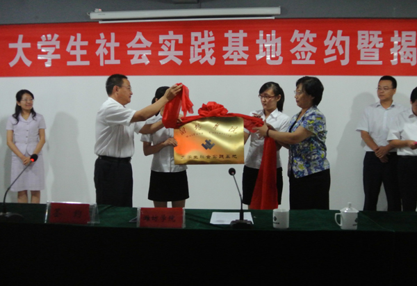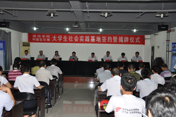 本站讯 日前,我校大学生社会实践基地签约暨揭牌仪式在中国宝石城昌乐举行。昌乐县副县长崔全华,我校纪委书记马茜华为社会实践基地揭牌并讲话。宝石城管委会副书记、副主任刘文涛和我校团委负责同志共同签约。昌乐县及我校团委有关负责同志等参加了揭牌仪式。