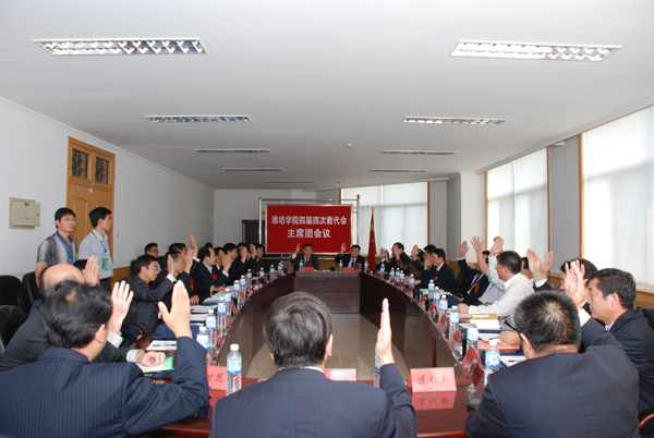 辛丕宏主持召开了主席团会议。主席团听取了各代表团的审议情况汇报,审议并通过了《关于〈院长工作报告〉的决议》(草案)、《关于〈学校财务工作报告〉的决议》(草案)、《“爱校、敬业、奉献”主题活动倡议书》(草案)和其他事项。