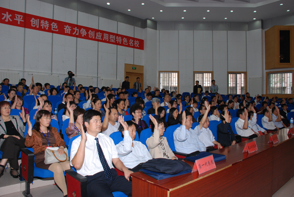 会议号召,当前学校正处于全面推进教育教学改革、积极推动内涵发展转型提升的关键时期,机遇与挑战并存,希望与困难同在,让我们在学校党委的坚强领导下,抓住机遇,迎接挑战,凝心聚力,创新发展,为加快建设应用型特色名校而努力奋斗。