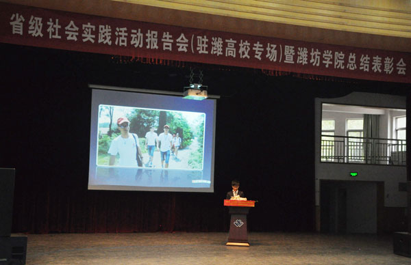 本站讯 9月27日,省级社会实践活动报告会(驻潍高校专场)暨潍坊学院总结表彰会在闻韶楼报告厅举行。由潍坊医学院、山东科技职业学院、潍坊职业学院和我校组织的六支团中央、省级暑期社会实践重点团队分别作了实践成果汇报。学校纪委书记马茜华、共青团潍坊市委副书记陈珊珊出席会议,并为我校2013年暑期社会实践先进集体和优秀个人代表颁奖。驻潍高校团委代表,学校团委班子成员、各学院团委书记、学生代表共计300余人参加了报告会。