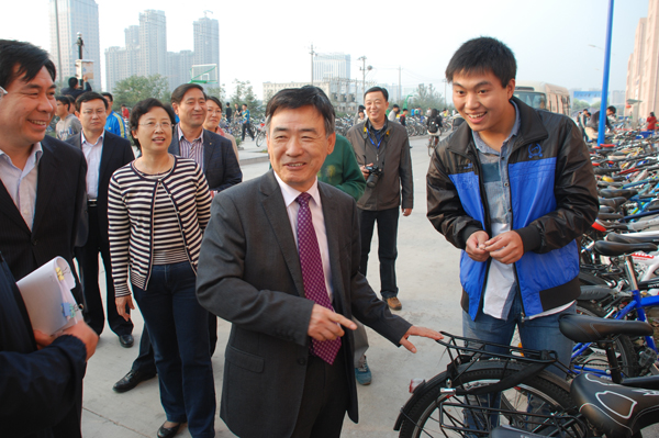 王守伦一行首先来到了生活服务室、开水房、洗衣房、学业指导室和图书阅览室,与正在值班的老师、学生进行了交流,详细询问了与学生生活、学习密切相关的问题。看到图书阅览室存放的书不够多,王守伦要求相关职能部门要想办法尽快解决图书问题。随后他们来到了校医院门诊,当听校医院大夫说门诊值班室没有暖气片时,校领导们仔细查看了暖气管道,要求总务处在供暖之前将暖气接入值班室,解决老师值班的冷暖问题。在学生餐厅,学校领导边看边听取了餐厅有关负责人的汇报。餐厅面积虽然不是很大,但是餐厅环境洁净卫生,大一新生基本杜绝了用塑料袋盛装饭菜的现象,学校领导表示极大赞赏。王守伦说,从大学一年级养成的好习惯,一定要保持下来。明年他们这批学生上大二的时候,就要入住主校区,希望到时候他们也能主动杜绝白色污染,自觉使用学校提供的不锈钢餐具。当王守伦看到餐厅设有自助微波炉供学生使用时,王守伦在给予充分肯定的同时,希望餐厅将这一举措在学校一餐二餐推广,以方便学生就餐。随后王守伦一行来到学生活动区。这里环境优雅,有花草,有小竹林。绕过用石子铺成的小路,有一排排供学生们休憩的座椅。学生们三三两两,有的在看书,有的在听音乐,有的在聊天。王守伦希望学生们能充分利用这里的优美环境,陶冶身心。弘德书院保卫室旁边,保卫处工作人员正在给学生们的自行车用数控打码器打码。保卫处负责同志介绍说,为了方便自行车管理,他们在学生的每一辆自行车车梁上,打上了学生的学号。同时他们也和公安部门沟通,尽最大努力杜绝自行车被盗的现象。王守伦看到一男生正在停放自行车,便与学生攀谈起来,向他了解对自行车停放存取的意见和建议。在调研即将结束时,王守伦一行发现弘德书院门口有学生脚踩轮滑出入,在十字路口有学生不走斑马线,甚至有学生无视红绿灯等不遵守交通法规的现象,学校领导要求各相关职能部门一定要教育学生珍视生命,自觉遵守交通法规。