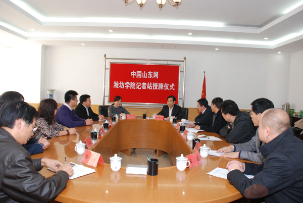本站讯 12月6日,中国山东网潍坊学院记者站授牌仪式在我校举行,中国山东网总编辑李红梅、潍坊市互联网管理处主任白钢、我校党委副书记牛钟顺出席仪式并讲话。潍坊市委宣传部副部长刘玉祥出席仪式。仪式由党委宣传部负责同志主持。仪式上,中国山东网总经理司文浩向我校党委宣传部有关负责同志授记者站牌匾,牛钟顺向中国山东网内容总监毕贞云授《潍坊学院大学生教学实践基地(中国山东网)》牌匾。