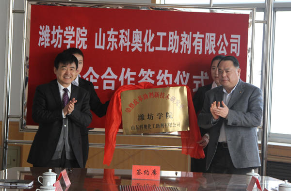 山东科奥化工助剂有限公司是一家集科研、生产、应用于一体的大型专业助剂生产公司。丁子信说,双方合作将会有力地提升该公司的研发水平,同时也将有助于提升化学化工与环境工程学院的科研水平和服务地方经济的能力。他希望双方以新技术研究室为平台,精诚合作努力攻关,在纺织染整、皮革助剂领域取得新的突破。